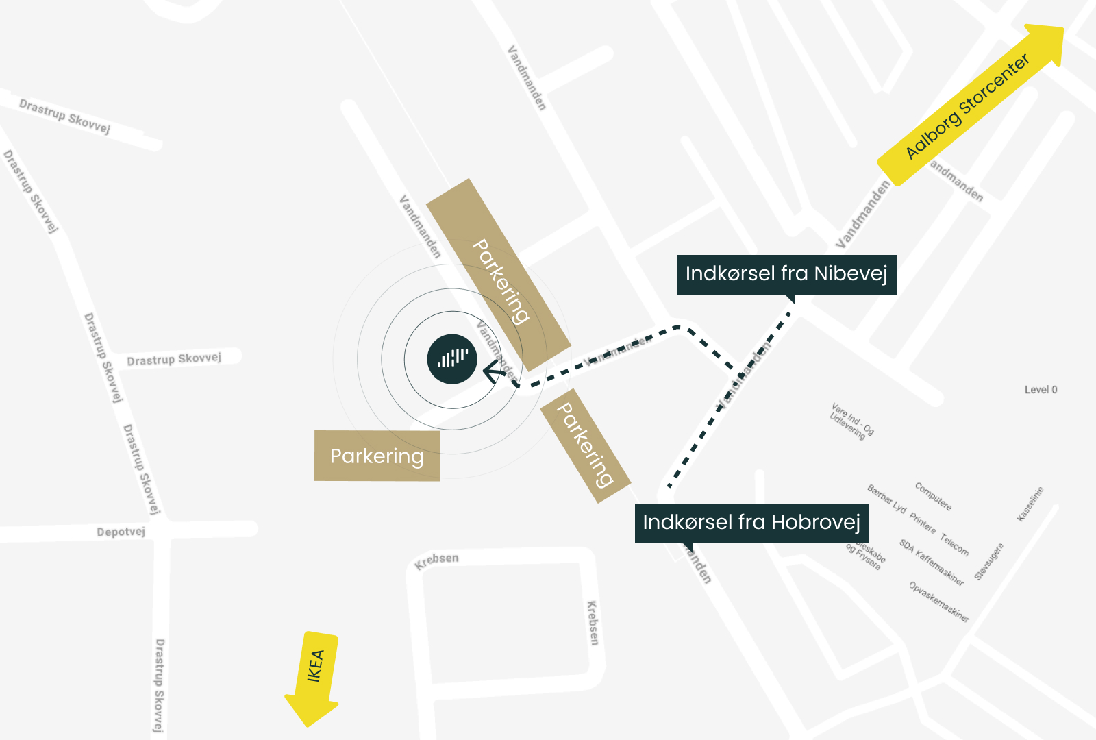 Hvis du kommer inde fra Aalborg, kan du med fordel tage ‘Bybus 16’ mod Ferslev og stå af ved ‘Stationsmestervej. Herfra er der ca. 4 minutters gang.
