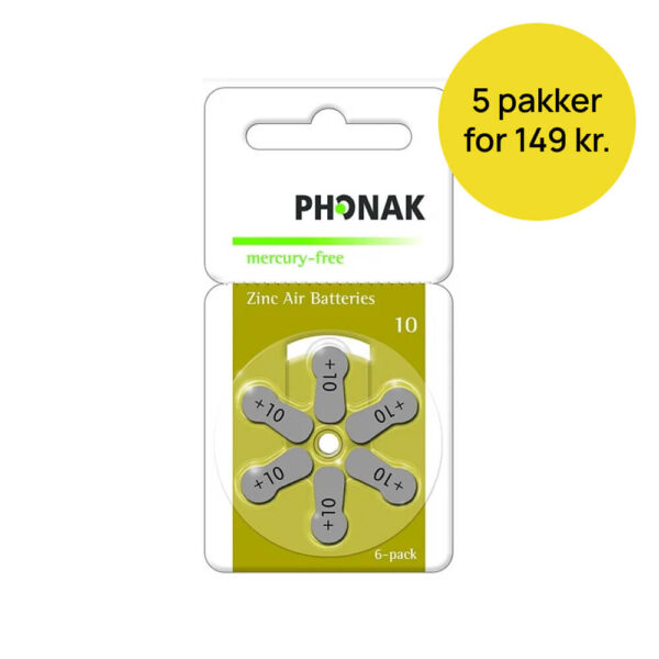 Skift batterierne i dine høreapparater regelmæssigt for at opretholde optimal lydkvalitet. Phonak 10 batterier er miljøvenlige og leverer høj ydeevne, ideelle til enheder med kraftfulde behov. Farvekodede emballager gør det nemt at finde den rette størrelse. Vælg det miljøbevidste valg med Phonak 10 batterier. Passer til: Alle høreapparater der bruger størrelse 10 batterier. Kontakt vores kundeservice hvis du er i tvivl. Pakken indeholder:  6 stk. Phonak 10 batterier.